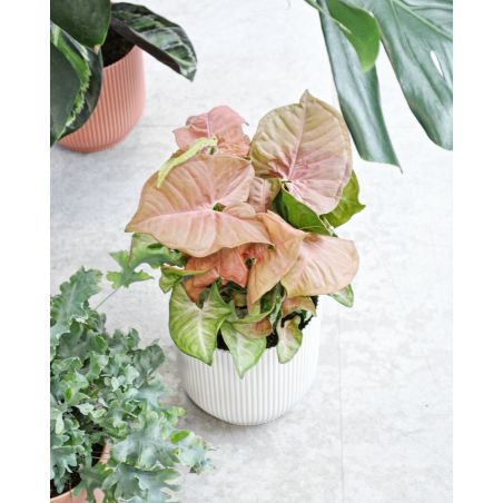 Syngonium to roślina o delikatnych, sercowatych liściach w różnych odcieniach zieleni i różu. Jest to roślina pnąca, która z powodzeniem może być uprawiana zarówno przy podporach, jak i w wiszących doniczkach. Uprawa Syngonium jest stosunkowo łatwa, dlatego świetnie nadaje się dla początkujących ogrodników. Preferuje jasne, ale rozproszone światło, unikać należy bezpośredniego nasłonecznienia, które może prowadzić do poparzenia liści. Syngonium dobrze rośnie w umiarkowanie wilgotnym podłożu – najlepiej podlewać, gdy wierzchnia warstwa ziemi przeschnie. Zimą podlewanie należy ograniczyć.