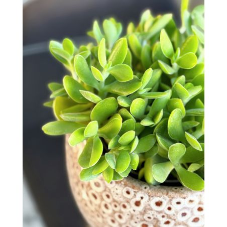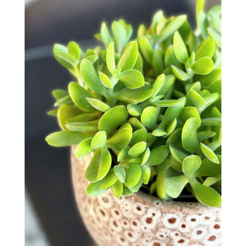 Rzadka odmiana grubosza o owalnych liściach w delikatnym odcieniu zieleni.